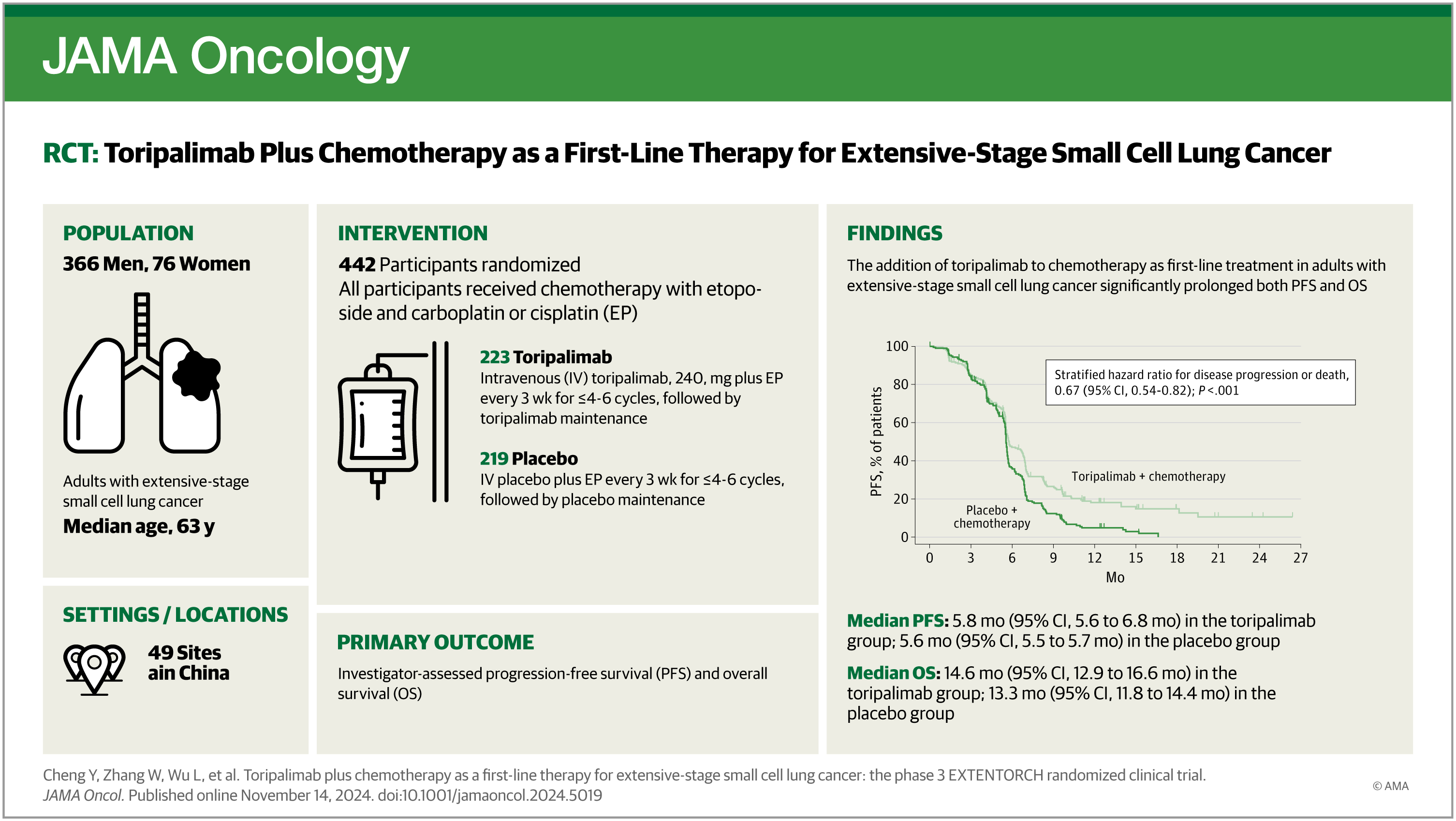 当地时间11月14日,由吉林省肿瘤医院程颖教授牵头开展的特瑞普利单抗联合化疗一线治疗广泛期小细胞肺癌 (ES-SCLC) 的III期EXTENTORCH研究结果发表在国际肿瘤学顶级期刊《美国医学会杂志·肿瘤学》 (JAMA Oncology,IF2023=22.5),为ES-SCLC一线免疫治疗再添重磅循证医学证据。程颖教授为本文的第一作者和通讯作者。